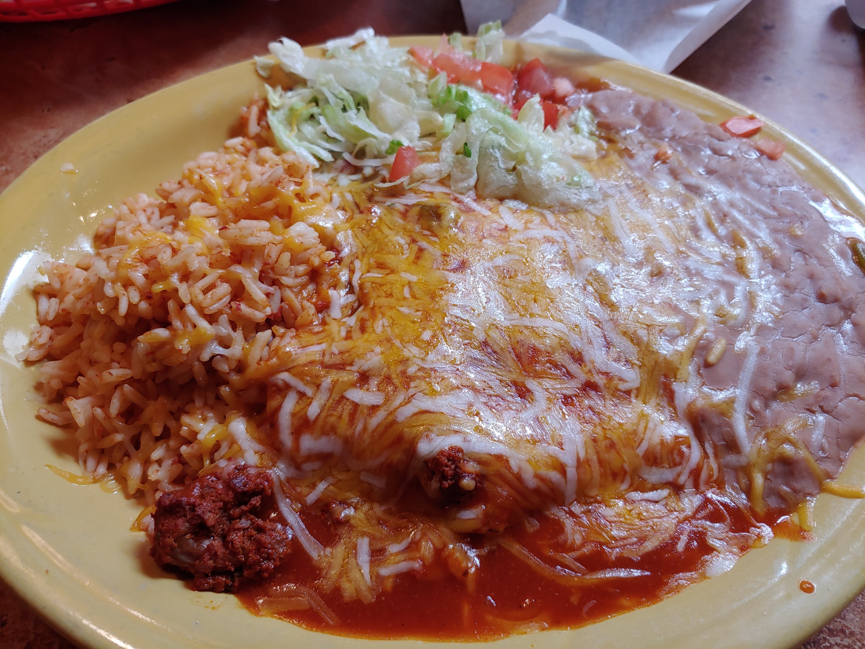 In New Mexico, the enchiladas are served stacked instead of rolled, like these at Little Anita’s (with huge sopapillas for dessert).